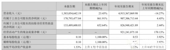 汤臣倍健三季度财报显示,公司前三季度营业收入为49.15亿元,同比下降14.27%,归母净利润为9.07亿元,同比增长4.45%,呈现增利不增收的情形。其中,公司第三季度营业收入同比增长23.45%至13.83亿元,归母净利润由去年同期的亏损2241.65万元增至盈利1.71亿元,同比大幅增长861.91%,成功实现扭亏为盈。