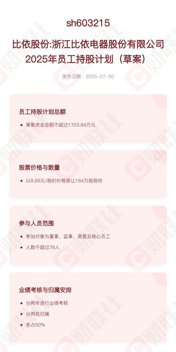 财联社7月30日电,比依股份公布2025年员工持股计划(草案),参加对象为公司或其下属公司任职的董事、监事、高级管理人员、核心管理人员及核心骨干员工,总人数不超过78人。拟筹集资金总额为不超过1703.84万元,以“份”作为认购单位,每份份额为1元。购买价格为9.26元/股,回购股份数量不超过184万股,占公司股本总额的0.979%。存续期为36个月,锁定期为12个月。业绩考核年度为2025年和2026年两个会计年度,分年度进行业绩考核。