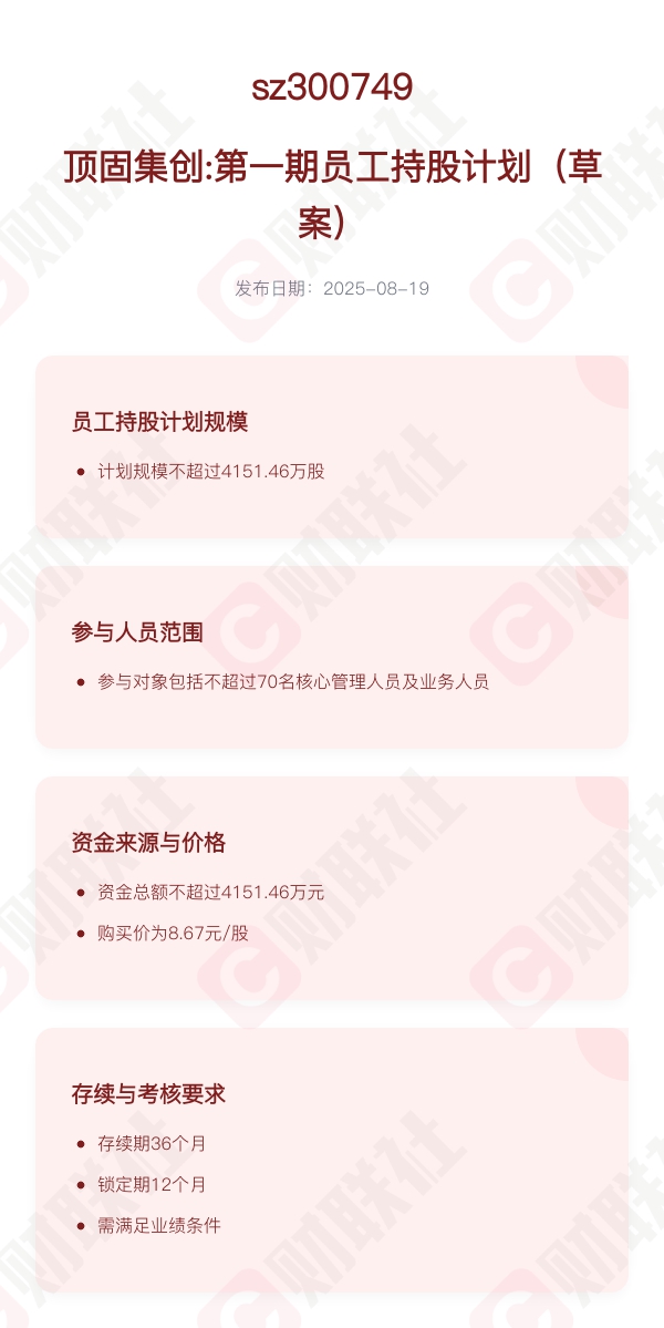 财联社8月19日电,顶固集创第一期员工持股计划规模不超过4151.46万股,参加对象包括公司董事(不含独立董事)、高级管理人员3人以及不超过67名核心技术(业务)人员。该计划拟筹集资金总额不超过4151.46万元,资金来源为员工合法薪酬、自筹资金以及法律法规允许的其他方式。购买价格为8.67元/股,为董事会决议前一个交易日公司股票交易均价。存续期为36个月,锁定期为12个月。考核要求为公司层面业绩考核,需满足以2025年为基数,2026年营业收入增长率不低于20%。