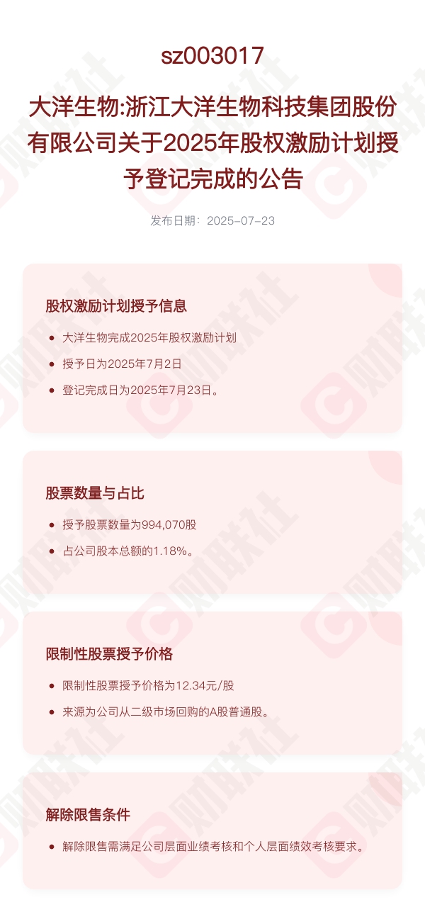 财联社7月23日电,大洋生物已完成2025年股权激励计划授予限制性股票登记工作,授予日为2025年7月2日,登记完成日为2025年7月23日。本次激励计划授予的股票数量为994,070股,占公司股本总额的1.18%,限制性股票授予价格为12.34元/股,股票来源为公司从二级市场回购的公司A股普通股,涉及激励对象合计7人。授予对象包括公司董事、高级管理人员、中层管理人员及技术(业务)骨干。授予的限制性股票限售期分别为自授予的限制性股票登记完成之日起12个月、24个月。解除限售条件包括公司层面业绩考核和个人层面绩效考核。公司未满足业绩考核目标的,所有激励对象对应考核当年可解除限售的限制性股票均不得解除限售,由公司回购注销。个人层面考核结果与个人层面系数(N)挂钩,若各年度公司层面业绩考核达标,激励对象个人当年实际解除限售额度=个人层面系数(N)×个人当年计划解除限售额度。