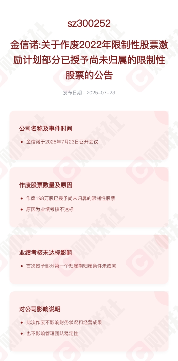 财联社7月23日电,金信诺于2025年7月23日作废了2022年限制性股票激励计划已授予尚未归属的34.94万股限制性股票。此次作废的原因包括21名激励对象离职以及公司及事业部在2023年的业绩考核未达标。作废的股票中,有10.75万股是由于激励对象离职而作废的,另外24.19万股则是由于公司和事业部的业绩考核未达标而作废。此外,预留部分尚未授予的15万股限制性股票也自动作废失效。此次作废不会对公司的财务状况和经营成果产生实质性影响,也不会对公司管理团队的稳定性产生重大影响。
