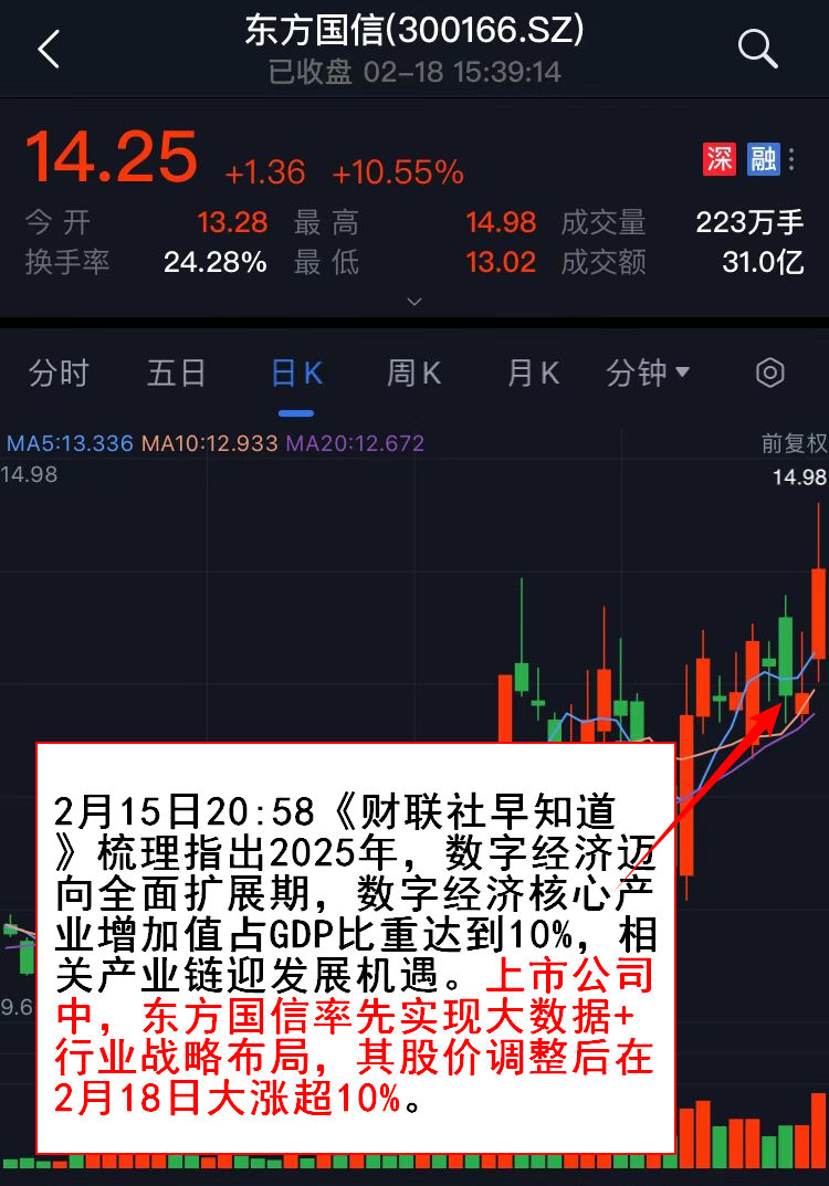 2月15日20:58《财联社早知道》梳理指出2025年,数字经济迈向全面扩展期,数字经济核心产业增加值占GDP比重达到10%,相关产业链迎发展机遇。上市公司中,东方国信率先实现大数据+行业战略布局,其股价在2月18日大涨超10%。