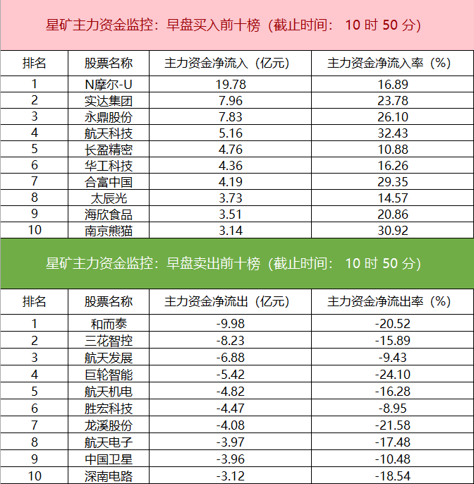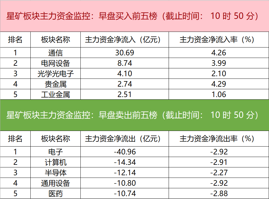 财联社12月5日电,财联社星矿数据显示,今日早盘主力资金净流入通信、电网设备、光学光电子等板块,净流出电子、计算机、半导体等板块,其中电子板块净流出超40亿元。个股方面,N摩尔-U大涨,主力资金净买入超19.78亿元位居首位,实达集团、永鼎股份、航天科技获主力资金净流入居前;和而泰遭净卖出超9亿元,三花智控、航天发展、巨轮智能资金净流出额居前。