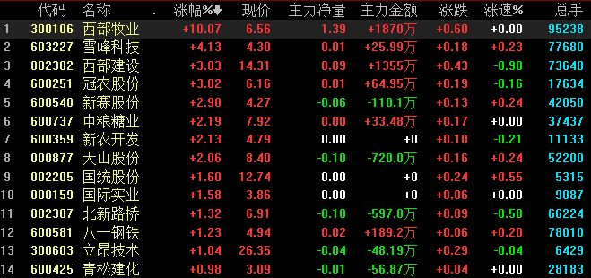 财联社2018年8月31日讯,新疆板块早盘逆市拉升,龙头西部牧业强势封涨停,雪峰科技大涨4%,光正集团、西部建设、德新交运、冠农股份纷纷跟涨。发改委此前表示,将抓紧推进一批西部急需的重大工程建设。