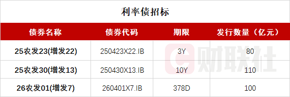财联社1月28日电,按照此前公布的发行计划,中国农业发展银行将于14:00-15:00招标发行三期金融债,分别为:中国农业发展银行2026年第一期金融债券(第七次增发),期限378D,发行量不超过100亿元,票面利率1.5%;中国农业发展银行2025年第二十三期金融债券(第二十二次增发),期限3Y,发行量不超过80亿元,票面利率1.61%;中国农业发展银行2025年第三十期金融债券(第十三次增发),期限10Y,发行量不超过110亿元,票面利率1.82%。