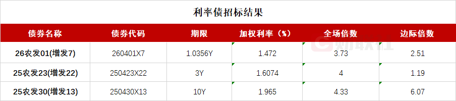 【农发行三期金融债已结束招标 10年期品种中标收益率1.965%】