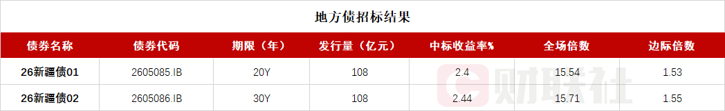 【新疆自治区政府两期地方债已招标结束 投标倍数均在15倍之上】
