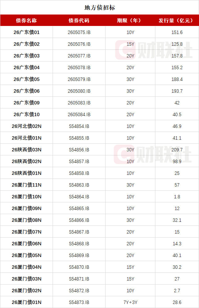 【今日将发行四批次地方债 包括广东、河北、陕西、厦门】
