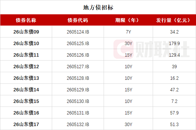 【山东省政府将于14:00-14:40招标发行九期地方债 期限7-30年不等】