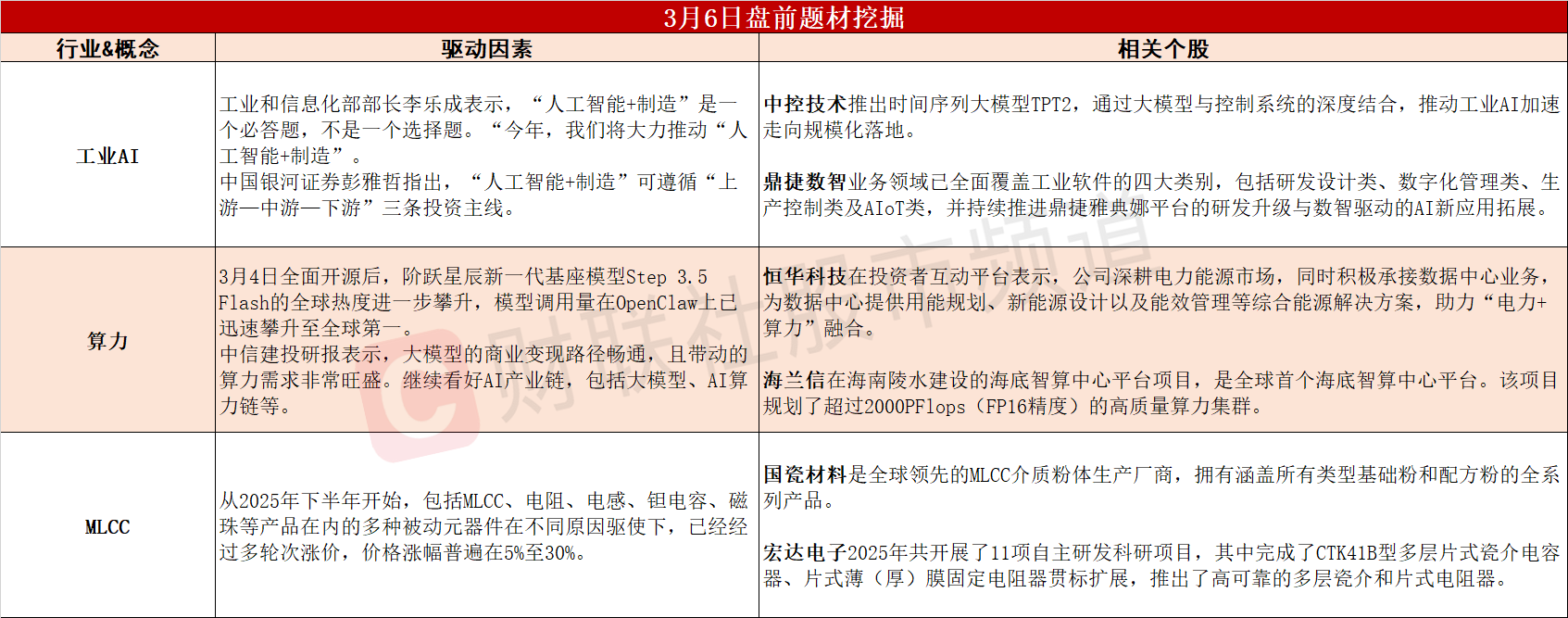 ①工信部今年将大力推动“人工智能+制造”,工业智能化赛道迎来强催化。②大模型商业变现路径畅通,有望带动算力需求持续旺盛。③AI快速发展拉动需求,机构称MLCC涨价周期有望延续至2026年。